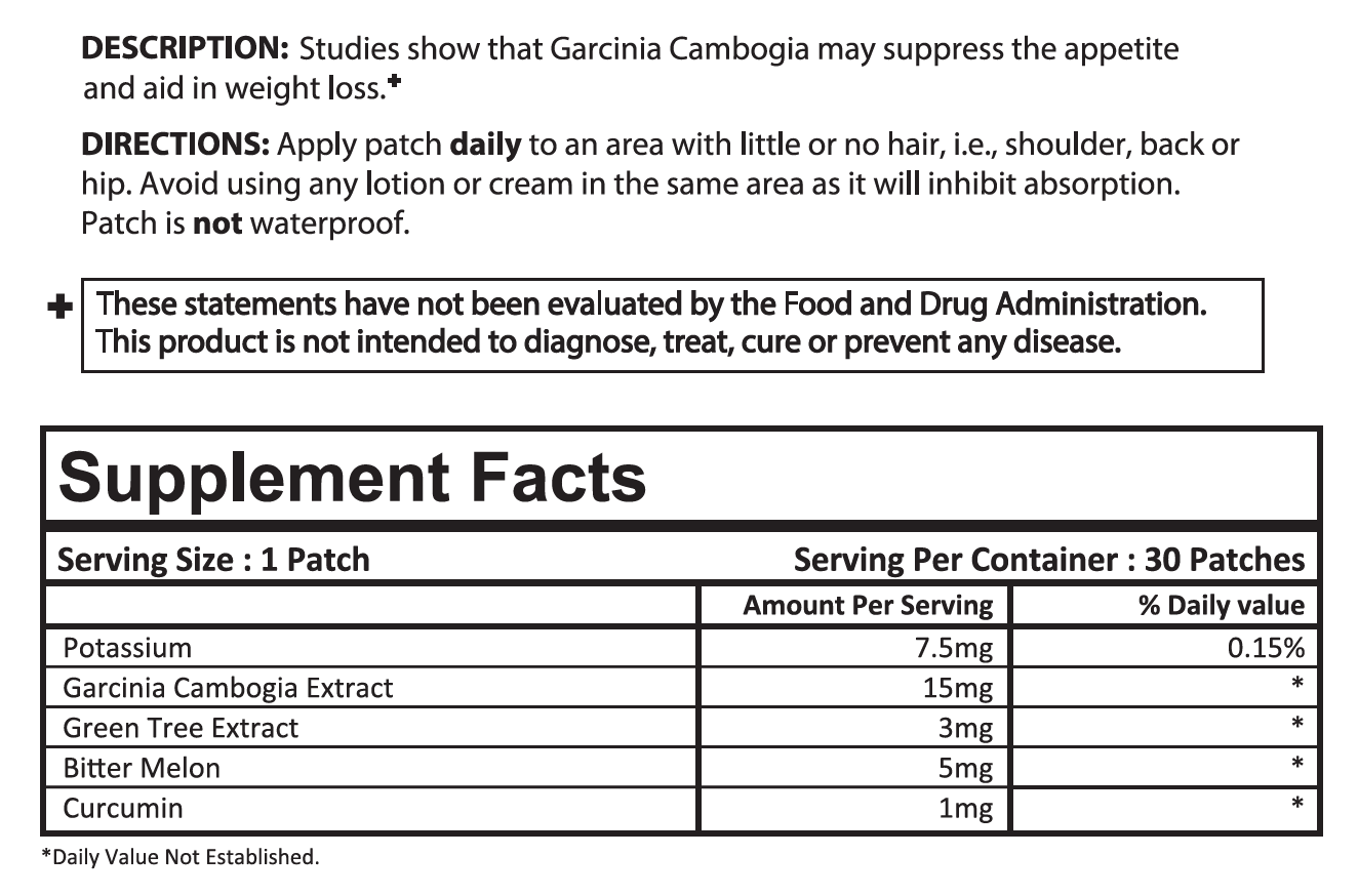 Apply patch daily to an area with little or no hair, i.e., shoulder, back or hip. For best results, it is recommended to wear PatchMD patches for 8 hours. There is no additional benefit wearing the patch longer than 8 hours. Avoid using any lotion or cream in the same area as it will inhibit absorption. Patch is not waterproof. It is OK to wear multiple patches at a time. It is recommended that Garcinia Cambogia Plus Topical Patch can be worn during the morning or afternoon for best results.