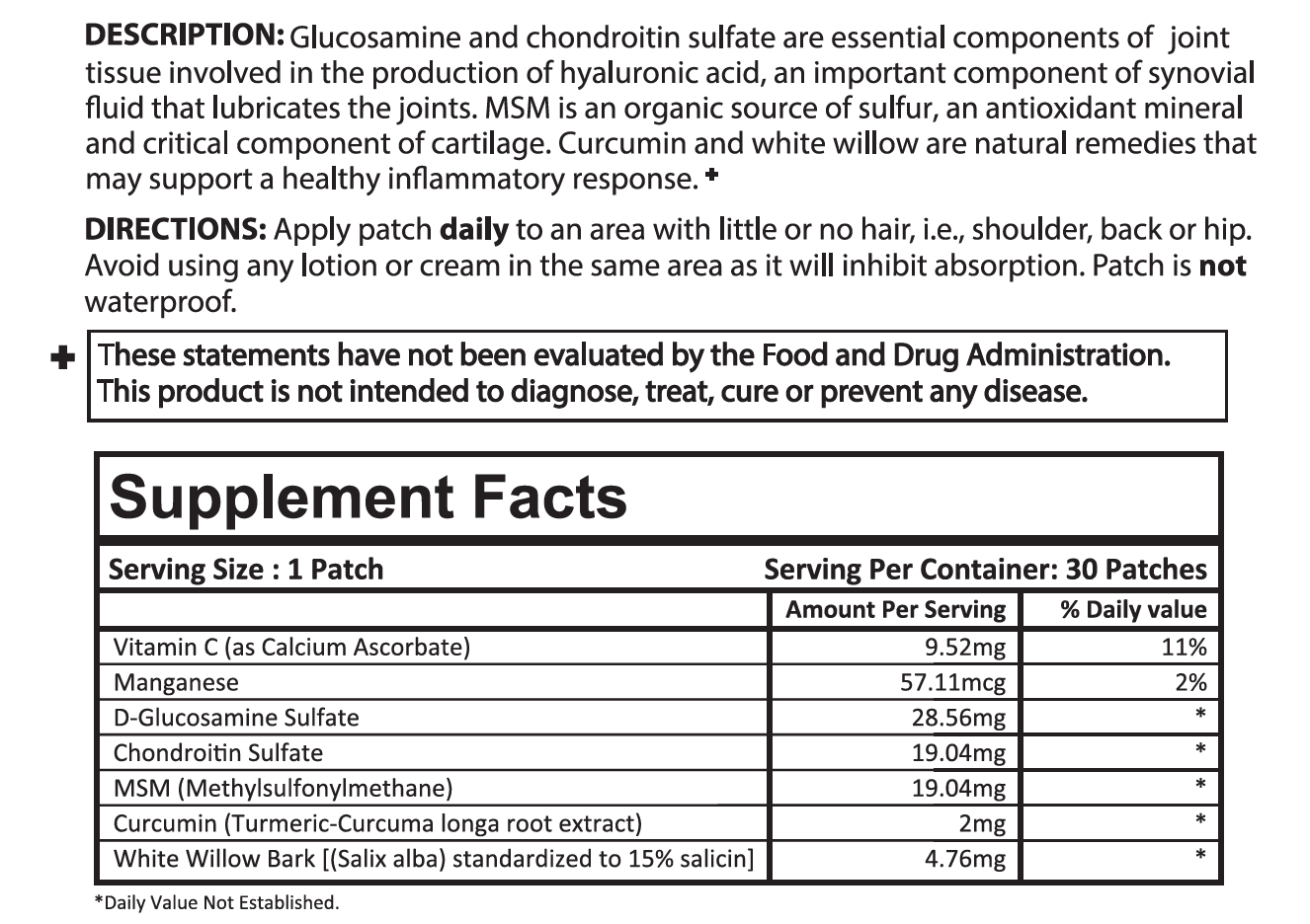 Please try the Glucosamine & Chondroitin patch today and discover natural relief. After all, what do you have to lose except pain and discomfort? Your freedom is one step away.*