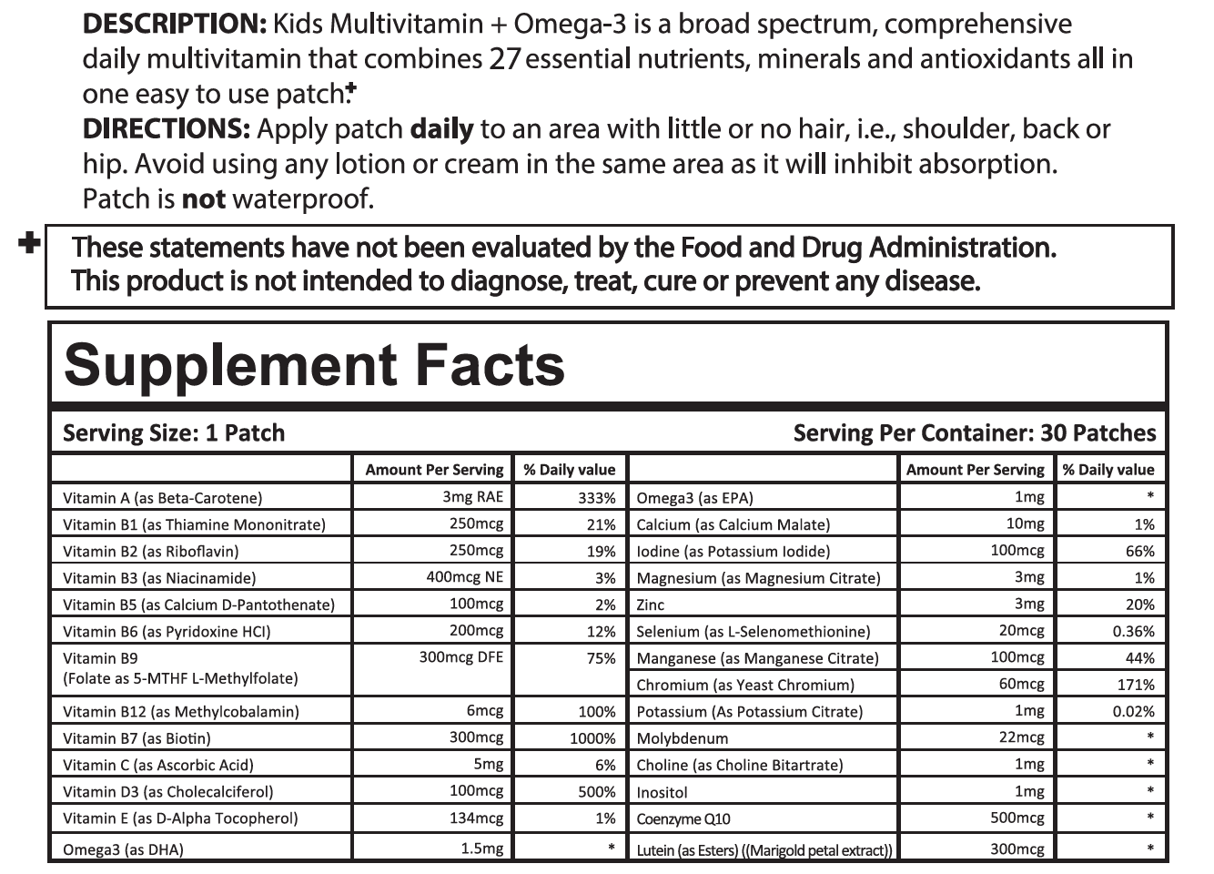 Our Kids Multi + Omega-3 topical patch is a broad spectrum, comprehensive daily multi that contains everything your child needs for healthy growth. It combines 26 essentials, minerals, and antioxidants into one easy-to-use patch.